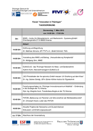 Thüringer Zentrum für Existenzgründungen und Unternehmertum Forum "Innovation in Thüringen" TAGESORDNUNG Donnerstag, 7. März 2013 von 14:00 Uhr - 17:00 Uhr Ort: IMMS – Institut für Mikroelektronik- und Mechatronik - Systeme gGmbH Ehrenbergstraße 27 D-98693 Ilmenau Ablauf: 14:00 Uhr 14:05 Uhr Eröffnung und Begrüßung Dr. Matthias Schulze, GF FTVT e.V., Detlef Schmidt, ThEx Vorstellung des IMMS und Beitrag „Herausforderung Komplexität“ Dr. Wolfgang Sinn, IMMS 14:45 Uhr ELMUG eG - das Thüringer Netzwerk für Mess- und Gerätetechnik Kathrin Kühn, Netzwerkmanagerin ELMUG e.G 15:05 Uhr …