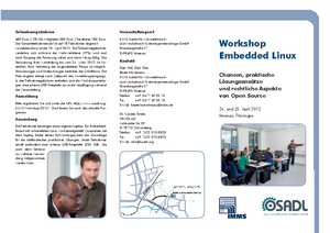 Teilnahmegebühren Veranstaltungsort 680 Euro | OSADL-Mitglieder 380 Euro | Studenten 180 Euro. Die Gesamtteilnehmerzahl ist auf 18 Teilnehmer begrenzt. Anmeldeschluss ist der 10. April 2012. Die Teilnahmegebühren verstehen sich inklusive der Mehrwertsteuer (19%) und sind nach Eingang der Rechnung sofort und ohne Abzug fällig. Die Stornierung Ihrer Anmeldung bis zum 24. März 2012 ist kostenfrei. Eine Vertretung der angemeldeten Person ist möglich. Stornierungen und Umbuchungen bedürfen der Schriftform. Die Platzvergabe erfolgt nach Zeitpunkt des Anmeldungseingangs. In den Teilnahmegebühren…