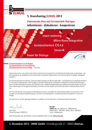 5. Branchentag ELMUG 2012 Elektronische Mess-und Gerätetechnik Thüringen informieren · diskutieren · kooperieren smart metering Mikro-Nano-Integration Gerätesicherheit 4.0 Sensorik Mit freundlicher Unterstützung der Raum für Dialoge Zusammenkommen ist ein Beginn, Zusammenbleiben ist ein Fortschritt, Zusammenarbeiten ist ein Erfolg. Henry Ford Kooperationen kleiner und mittlerer Unternehmen verbinden die Innovationskraft und Flexibilität des Mittelstandes mit den Kosten- und Leistungsvorteilen der Großindustrie. Der weitere Ausbau strategischer Kooperationen stärkt die Unternehmen im…