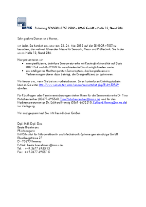 Einladung SENSOR+TEST 2012 – IMMS GmbH – Halle 12, Stand 284 Sehr geehrte Damen und Herren, wir laden Sie herzlich ein, uns vom 22.-24. Mai 2012 auf der SENSOR+TEST zu besuchen, der weltweit führenden Messe für Sensorik, Mess- und Prüftechnik. Sie finden uns in Halle 12, Stand 284. 284 Hier präsentieren wir • energieeffiziente, drahtlose Sensornetzwerke mit Routingfunktionalität auf Basis 802.15.4 und 6LoWPAN für verschiedenste Einsatzmöglichkeiten sowie • ein intelligentes Hochtemperatur-Sensorsystem, das beispielsweise in Verbrennungsmotoren dazu beiträgt, die Energieeffizienz zu…