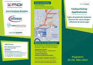 Mit freundlicher Unterstützung: Anreise zum Workshop Veranstaltungsort: Infineon Technologies Dresden GmbH Königsbrücker Str. 180 | 01099 Dresden Fachworkshop Applikationen Cyber-physikalische Systeme: Chancen für neue energieeffiziente Anwendungen ANMELDUNG Bitte registrieren Sie sich online bis zum 02. März 2012 Hier klicken! Die Tagungsgebühr beträgt 75,- € (für Vortragende fallen keine Gebühren an) Für Ihre Rückfragen steht Ihnen Silicon Saxony zur Verfügung - Tel.: +49 351 89 25 887 Wünschen Sie eine Übernachtung Für die Teilnahme am Workshop steht Ihnen ein Kontingent in folgendem…