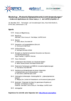 Workshop „Photonik/Optoelektronik/Licht-Anwendungen“ - Fachbereich Applikationen des Silicon Saxony e. V. und CoOPTICS/ OptoNet e.V. 26. November 2012 ∙ Technologie- und Innovationspark Jena, Hans-Knöll-Straße 6, 07745 Jena, Seminarraum 3. OG Agenda 12:30 Einlass und Registrierung 13:00 Begrüßung Uwe Gäbler | Silicon Saxony eV; Mike Böttger | CoOPTICS GmbH 13:10 Keynote Dr. Andreas Bräuer | Fraunhofer IOF 13:35 Temperatur- und Langzeitstabiles LED-Licht Dr. Fred Grunert | MAZeT GmbH 14:00 OLED-auf-Silizium Dr. Uwe Vogel| Fraunhofer COMEDD 14:25 Konzepte zur physikalisch-optischen…
