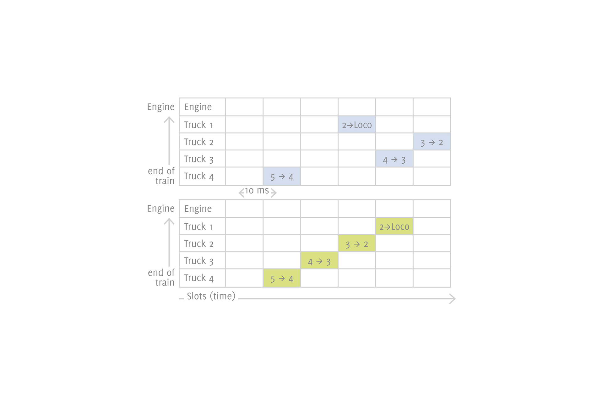 Diese Anforderung ist beträchtlich, da in Zügen zum einen die Funkausbreitung aufgrund der metallischen Umgebung suboptimal ist. Zum anderen kann ein Kommunikationsproblem nicht wie bei klassischen Netzwerkstrukturen durch andere benachbarte Sensormodule abgefangen werden, da die Module Waggon für Waggon linear angeordnet sind. Ein Datenpaket muss somit auf einem einzigen möglichen Weg Modul für Modul durch den Zug gereicht werden.