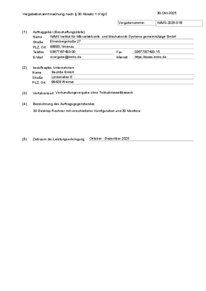 Nach den Vorgaben der jeweiligen Vergabe- und Vertragsordnungen (UVgO) im Unterschwellenbereich sowie der Thüringer Verwaltungsvorschrift zur Vergabe öffentlicher Aufträge (ThürVgG) informieren wir über vergebene Aufträge und aktuelle Ausschreibungen.
